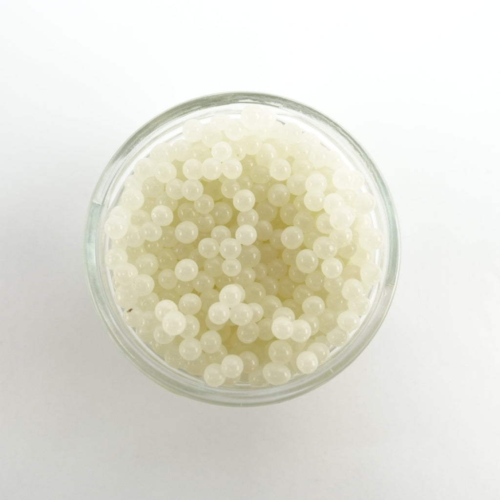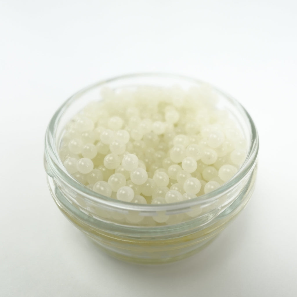 Appearance: Bright white, pearly spheres. About the size of salmon or trout roe.